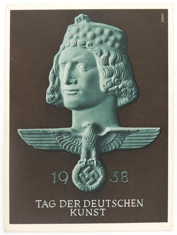 A 1938 official postcard commemorating the "Day of German Art". The postcard has been posted with a cancellation stamp for 1938 Munich. Measures approximately 10.5cm x 15cm.
