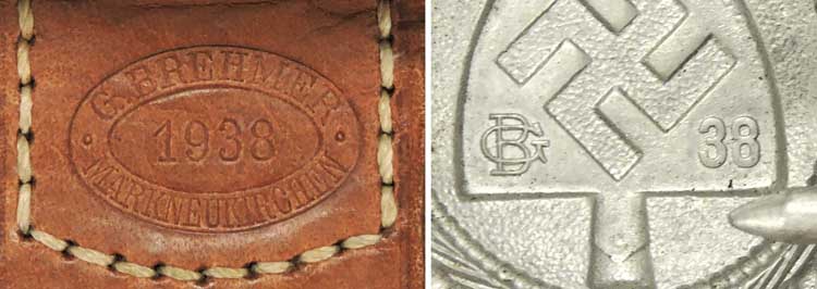 PHYSICAL DESCRIPTION: Early, injection molded, natural aluminum box buckle with a pebbled base field and a circular, embossed central motif. The central motif features five, high relief embossed sheaves of wheat encompassing an embossed, inverted, smooth, spade head with an embossed, canted, pebbled, swastika on a subtlety textured, domed, circular central field. The buckle shows light chafe wear which has resulted in a minor loss of detailing. The reverse of the buckle is a mirror image of obverse. The reverse has an integral, raised, slotted buckle catch and separate prong bar and prongs all intact. The reverse is also well marked with embossed, stylized, overlapping manufacturers initials and date "GB 38", indicating manufacture by Gustav Brehmer Markneukirchen in 1938. Complete with original leather pull tab. Nice!