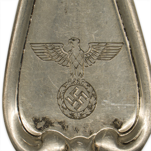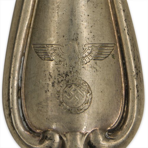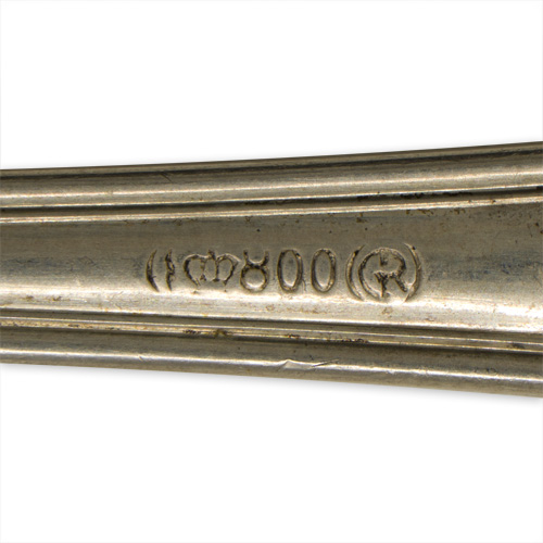 A setting consisting of a teaspoon, fork and table knife with the same pattern handles and engraved designs. The silver, one piece spoon and fork are both marked with a silver content of "800" as well as manufacture marked for Gebrüder Reiner (Brumbach Bayern). The two piece table knife has a silver handle marked "800", with a stainless steel blade that is marked "Rostfrei".