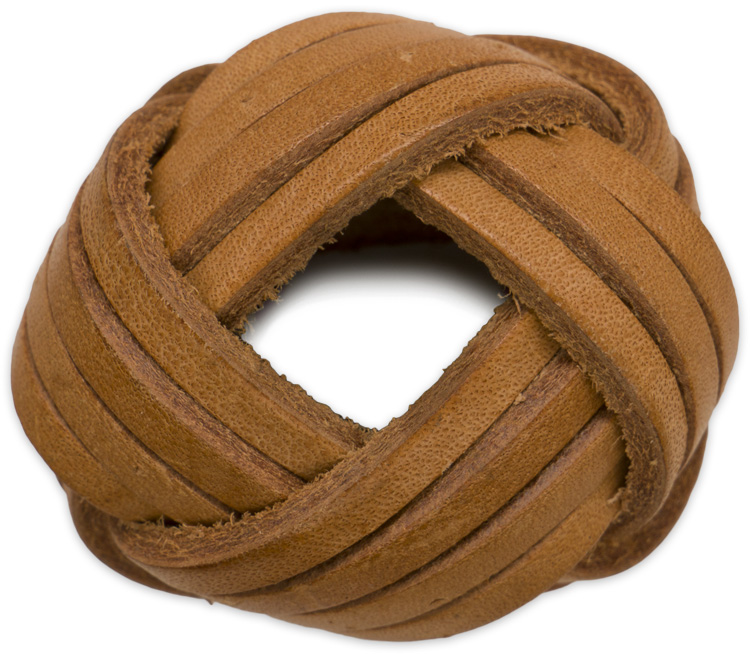 PHYSICAL DESCRIPTION: This 4.5cm x 2cm, brown leather knot is constructed of interwoven strands.