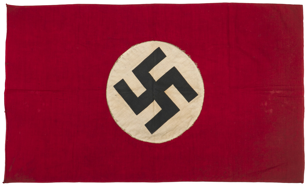PHYSICAL DESCRIPTION: Multi-piece cotton construction flag approximately 76cm x 46cm. To both its red fields are sewn white disks, with a printed mobile swastikas in black. Nice worn and used example showing the expected age and wear. One of the most popular captured bring back trophy items by our soldiers at wars end.