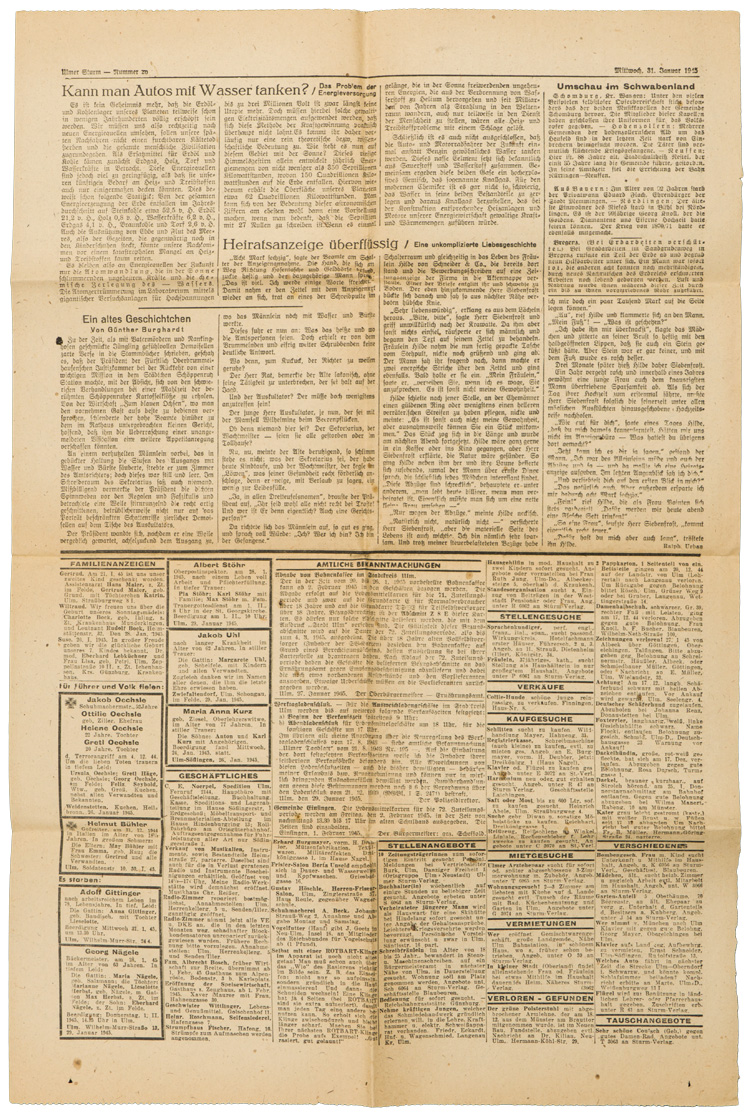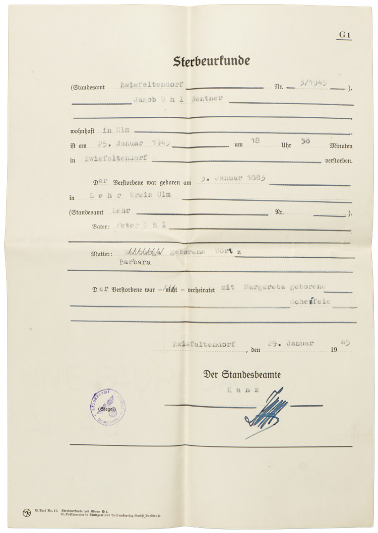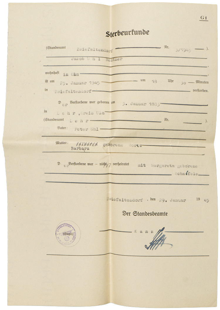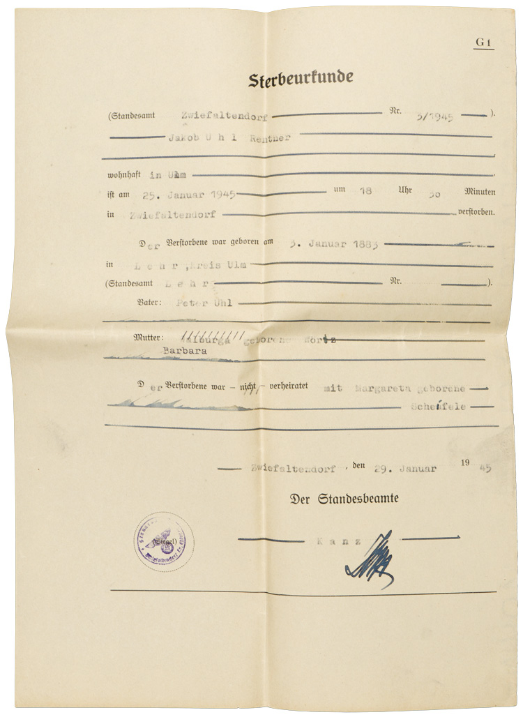 A 14cm x 36cm posted envelope, along with three typewritten and signed "Sterbeurkunde" or Death Certificates that are dated for "29. Januar 1945". Included is a page from a newspaper dated for "Diensteg, 30. Januar 1945" that has a death notice for the same person.