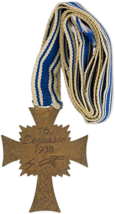 PHYSICAL DESCRIPTION: Second pattern, two piece, stamped tombac award with a bronze wash and blue and white enamel work. Award in the form of a Christian cross with outward fluted arms in semi-translucent blue enamel with white enamel border. Cross has a raised sunburst pattern emanating between its arms. Separate central circular field with white enamel base and black static swastika, encompassed by a circular border with embossed Latin script, "Der Deutschen Mutter", (The German Mother). Reverse has impressed simulated handwritten script, "16 Dezember 1938", and facsimile Hitler signature. Original ribbon section is also included.