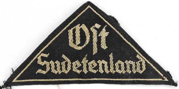 The BDM, Bund Deutscher Mädel, (League of German Girls), was the female counterpart of the male Hitler Jugend, (Hitler Youth), for girls aged 15-17, and was originally established in December 1928 as the Schwesternschaft der HJ, (Sisterhood of the HJ). In July 1930 the organization was re-designated Bund Deutscher Mädel and in April 1931 the JM, Jungmädelgruppe, (Young Girls Group), for girls aged 10-14, was established as the counterpart of the male Deutsche Jugend, (German Youth), On June 1ST 1932 the BDM/JM gained official status as an independent organization of the NSDAP. On January 1ST 1933 the HJ introduced a district sleeve triangle which identified the wearers unit location in the organizational control of the HJ, with the Obergebiet, (Higher Organizational Control), followed by the Gebiet, (Lower Organizational Control), until a restructuring in November 1936 replaced the Obergebiet level with the Obergau level. In April 1934 wear of the district sleeve triangles was extended to include BDM/JM personnel. The HJ district sleeve triangles featured golden yellow script while the BDM/JM district sleeve triangles utilized silver script.PHYSICAL DESCRIPTION: Black rayon construction isosceles triangle with a machine woven Gothic script in two lines, "Ost Sudetenland" in grey to its interior.