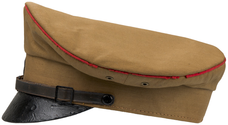 PHYSICAL DESCRIPTION: A light weight, ribbed tan cotton twill construction visor cap. The cap features a one piece circular crown, piped in red (some mothing), with a body with seams to each of its cardinal points, a one piece centerband whose vertical seam is to the back, and a leather visor. Eagle is missing, but would be an easy fix. Attached to the centerband is an enameled HJ badge. Fixed by the black painted, convex metal buttons positioned over each ear is a black leather chin strap. The interior of the cap is fully lined in copper colored cotton, and features a wide leather sweatband. Cap is size marked 56. Nice original RZM tag. Very nice, worn and used, untouched cap. Scarce to see with the leather visor.