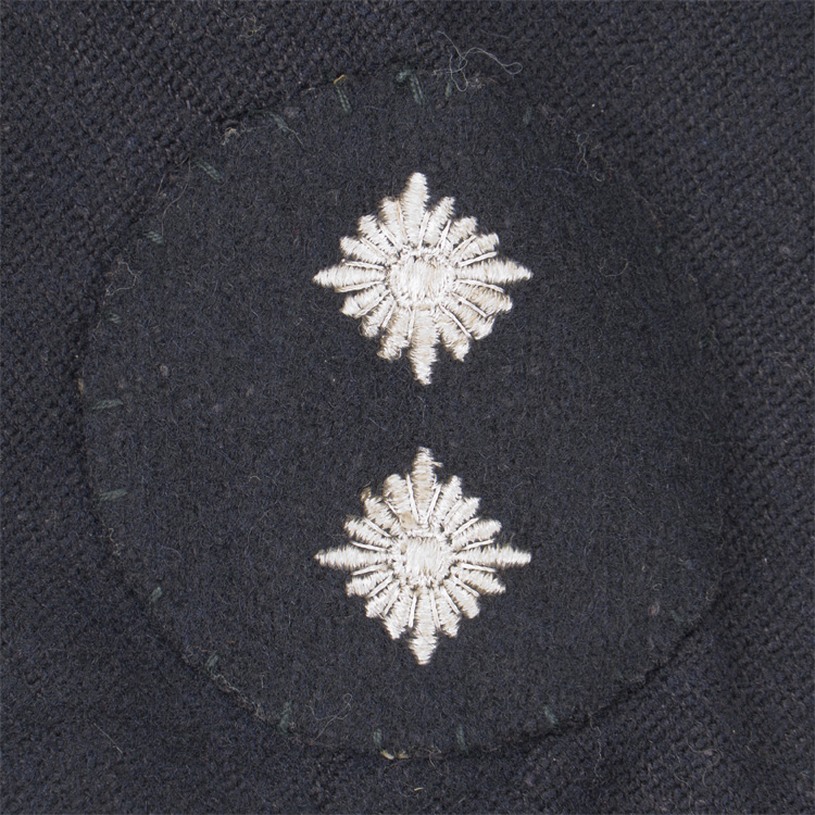 PHYSICAL DESCRIPTION: Coarsely woven, heavy navy blue wool/rayon blend, winter pullover shirt. Shirt features a four button front vertical closure plaquet with single metal hook and eye at neck. Shirt has two pleated patch breast pockets with scalloped button down flaps. All the buttons are the silver washed pebbled sheet metal type. Three of the four cuff buttons are missing and will need to be restored. Comes with a nice original pair of slip on shoulder straps. DJ Jungzugführer badge is hand sewn to the left sleeve. Unlined interior. Shirt roughly size 38" chest. Shirt was worn over the standard brown shirt and tucked into the winter pants. Faded oilcloth HJ/RZM tag is sewn to the inside front waist. Nice worn example that was used.