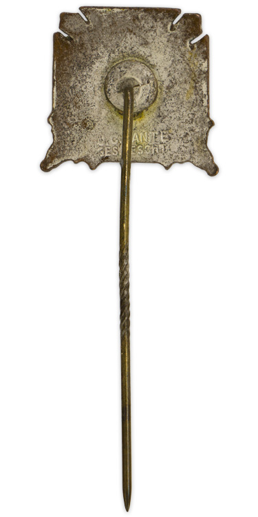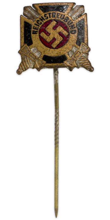 PHYSICAL DESCRIPTION: A 18mm x 18mm solid struck alloy badge in the form of an Iron Cross with black and red enamel work with a silver wash. Mobile swastika to its center with the words "REICHSTRUEBUND all sitting in top of crossed swords. "25" for number of years service is to the bottom of the badge. Reverse is maker marked "Gante" and "Ges. Gesch.," for "Gesetzlich Geschützt" (By-law Protected). Complete with its original 50mm rifled pin.