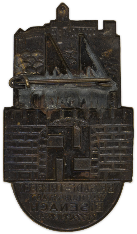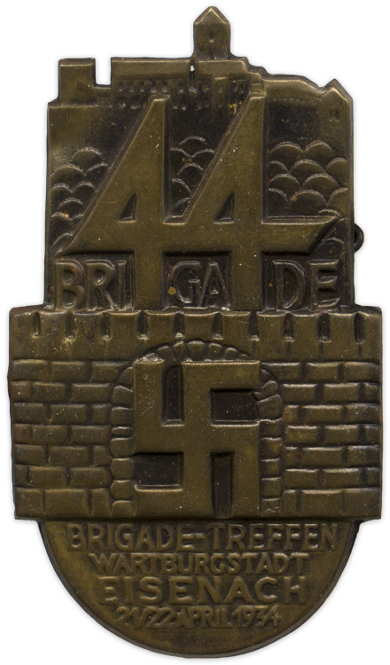 An approximately 32mm x 55mm die-stamped alloy badge with bronze wash. The badge depicts the walled city of Eisenach with a static swastika at its gate. The embossed text reads, "Brigade 44 Brigade-Treffen Wartburgstadt Eisenach 21/22 April 1934". Complete with pinback device.