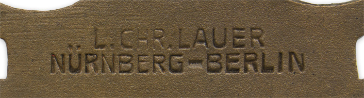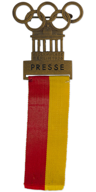 Press ribbon issued for the 1936 Berlin Summer Olympics, bronze, 43 mm x 114 mm, manufactured by Lauer, featuring the Olympics rings over the Brandenburg Gate. The front is engraved 'XI Olympiade Berlin 1936, Presse' With original red and yellow ribbon.