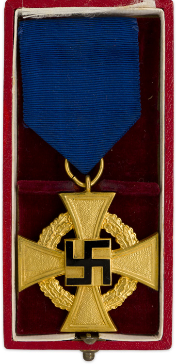 PHYSICAL DESCRIPTION: Die struck alloy, first class award with a fire gilt finish and black enamel work. The decoration is in the form of a cross Pattée with an embossed circular oak-leaf wreath extending between the arms of the cross. The center of the cross has a square plate with a black enameled static swastika to the obverse and embossed Gothic script to the reverse, "Für treue Dienste", (For Loyal Service). The arms of the cross have a slightly textured background field with smooth, dual stepped, raised outer edges. The fire gilt finish and the black enamel are both fully intact and the decoration is still very bright and clean. The ribbon suspension ring and loop are both intact. The decoration comes complete with an original piece of ribbed, moiré, cornflower blue ribbon with a brass pin back device handstitched to the reverse top edge. Also included is the original award case.