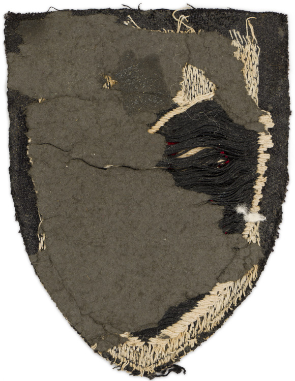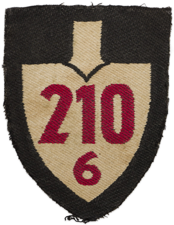 PHYSICAL DESCRIPTION: A 65mm x 80mm black rayon base to a machine woven black shield, upon which is woven an inverted white spade head, with "210" and "6", both in red, woven to it. The use of a black, rather than an earth-brown, shield indicates that the insignia was worn between August of 1933 and April of 1941. The white, rather than silver, coloration of the spade head indicates that it was worn by a non-commissioned rank. The larger red number indicates the "Gruppe" (Group) that the wearer was attached to, while the smaller number underneath indicate his "Abteilung" (Section) within it. This arm shield would have been worn on the left upper arm of the uniform. Glue spots to the reverse indicating it was most probably in a scrap book at some point. Uniform removed.