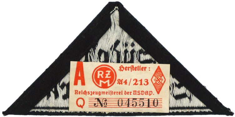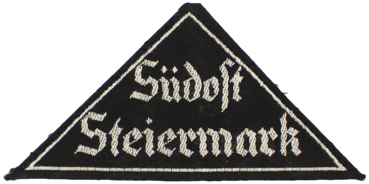 PHYSICAL DESCRIPTION: Black rayon construction isosceles triangle features machine woven Gothic script in two lines, "Südost Steiermark", in silver/grey threads. The triangle also has a narrow machine woven silver/grey border stripe near the outside edges. The triangle has a small section of its original black rayon factory roll folded and machine stitched to the reverse. The reverse of the has it original paper HJ RZM tag still in place. Very clean, untouched example. Nice.