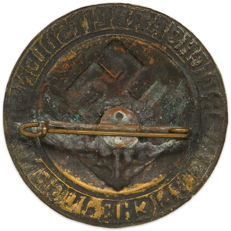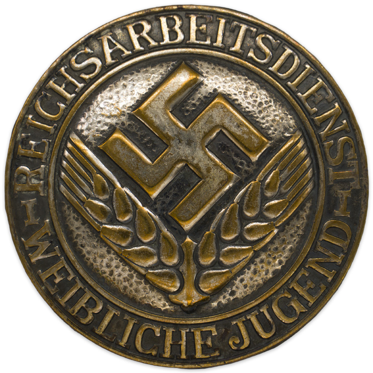 PHYSICAL DESCRIPTION: A 44mm diameter, brass/tombac construction RADwJ membership badge. Features a scripted outer border with the words "Reichsarbeitsdienst Weibliche Jugend" encompassing a pebbled field, upon which is embossed a mobile swastika held aloft by two sprigs of barley. Complete with original pin back.
