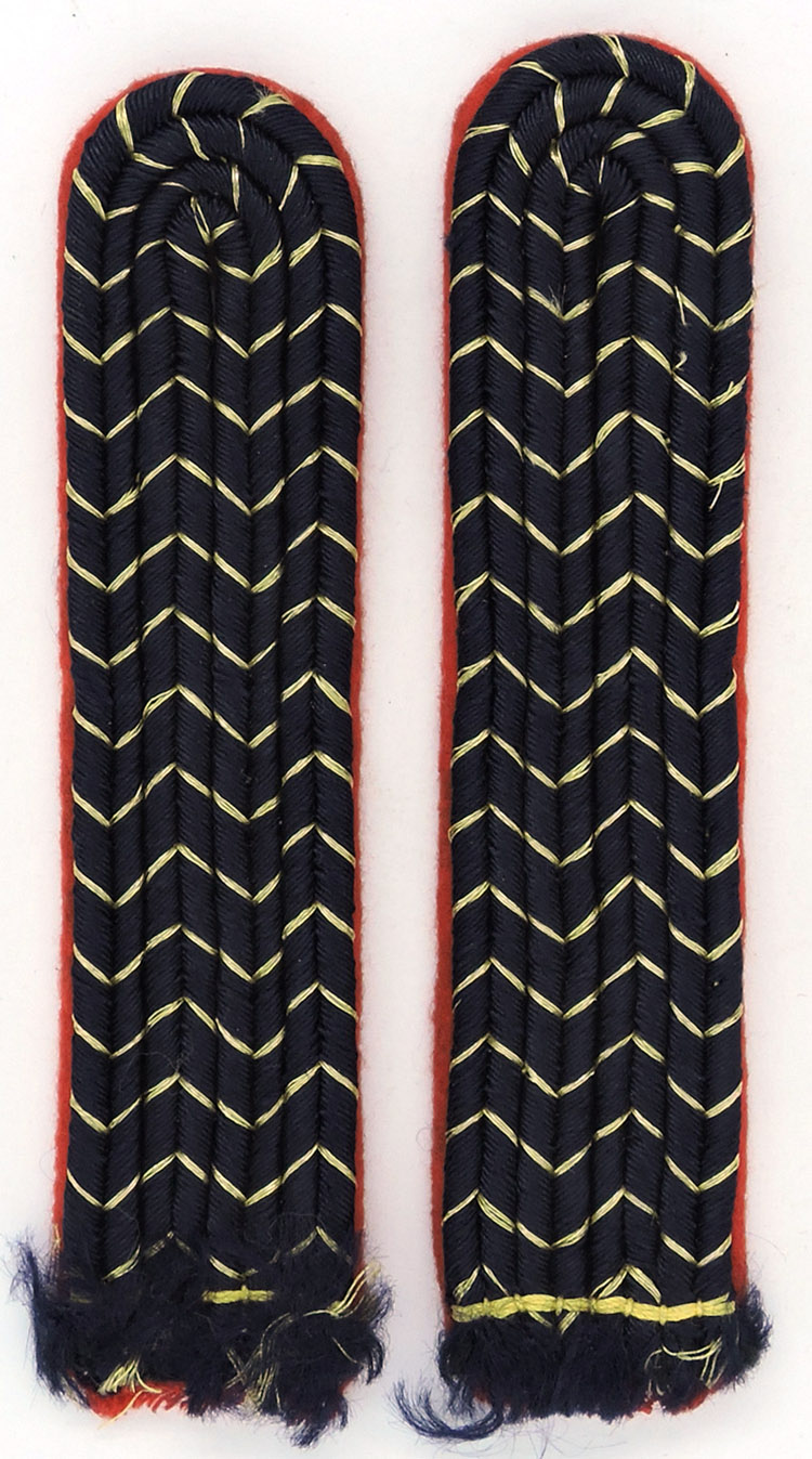 PHYSICAL DESCRIPTION: Sew on shoulder boards of navy blue Russian braid with evenly spaced golden yellow "V"s, on a red wool base.