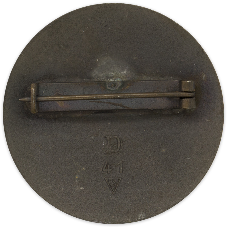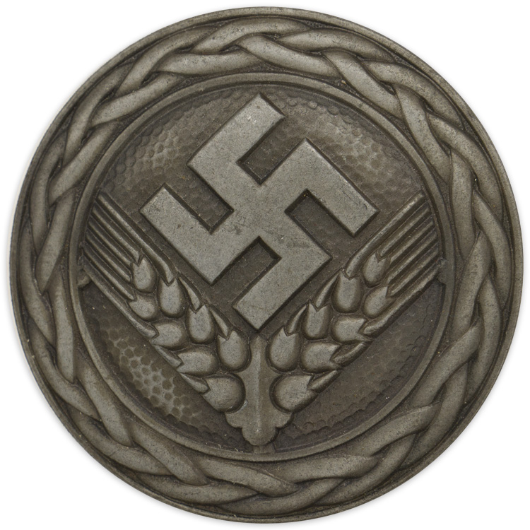 PHYSICAL DESCRIPTION: A die struck zinc, convex brooch measuring approximately 45cm in diameter that features a braided or "ornamented surround" that encompasses a pebble field, upon which is embossed a mobile swastika held aloft by two sprigs of barley. To the reverse is a horizontal pin-back device. Maker marked.