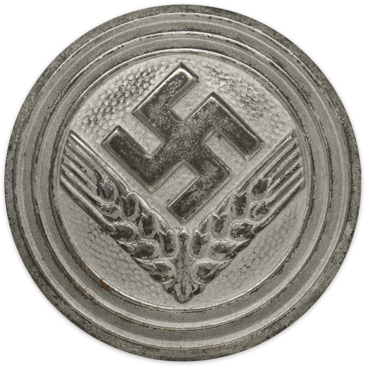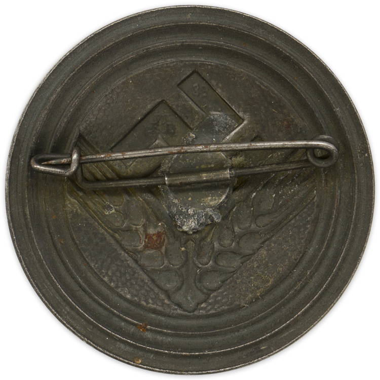 PHYSICAL DESCRIPTION: Third pattern, (1939), die struck, circular, alloy brooch is roughly 45mm diameter and features three embossed ridges to the outer edge border encompassing an embossed, canted swastika flanked by embossed sheaths of wheat on a pebbled background field. Complete with original pinback device. Assmann maker marked. Brooch is the "Iron" grade and the pattern indicates the rank of Kameradschaftsälteste.