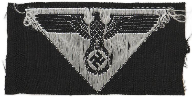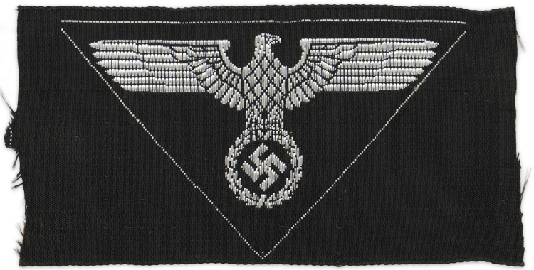 (Mützen Adler)Machine woven eagle. Flat, silver wire political eagle of a triangular black rayon back. Eagles wingspan measures 62mm. Near mint!