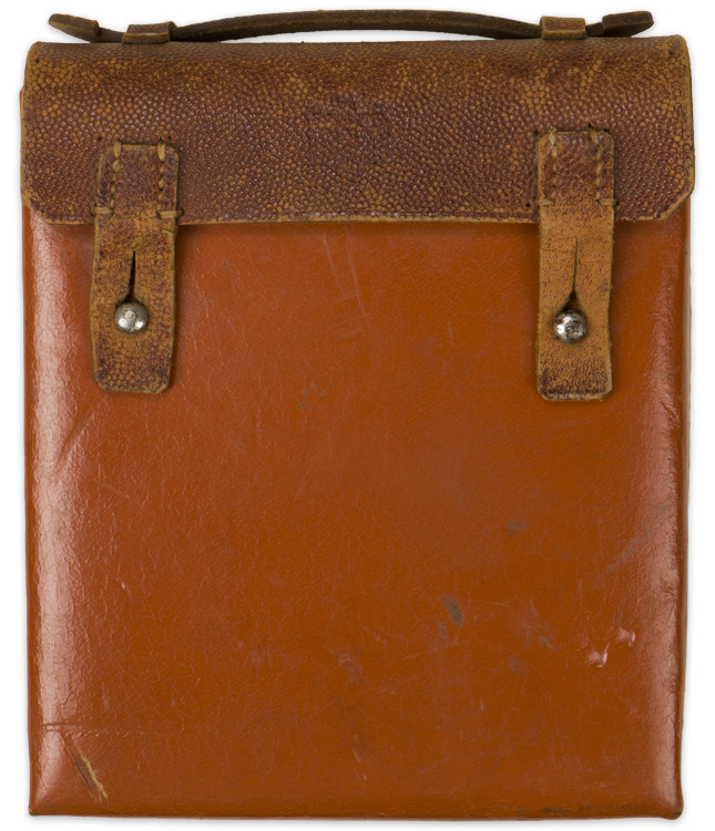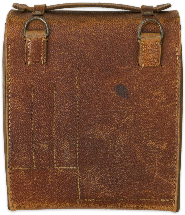 PHYSICAL DESCRIPTION: A red brown leather medical pouch, approximately 18cm x 21cm x 6cm. Two vertical leather tabs reinforced stitched around metal "D" rings, are to the upper part of its reverse. Its fold-over flap, which is an extension of the entire back panel, has two leather tabs that mate with a corresponding stud. When opened, the pouch opens at a ninety degree angle, exposing its contents. Collapsing, triangular leather flaps, reinforced stitched to the front and back panels construct a folding hinge. Original contents are complete as photographed. Nice!