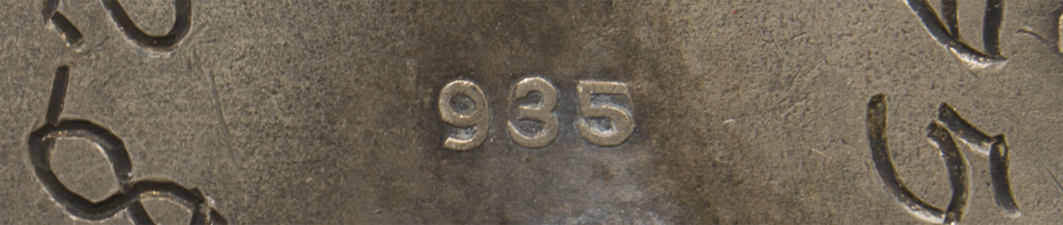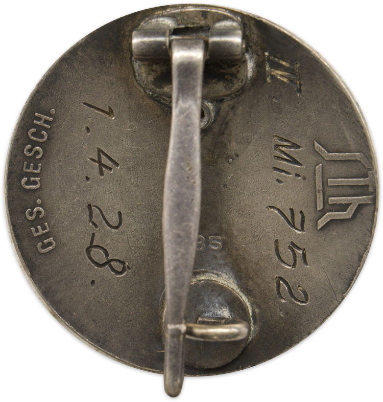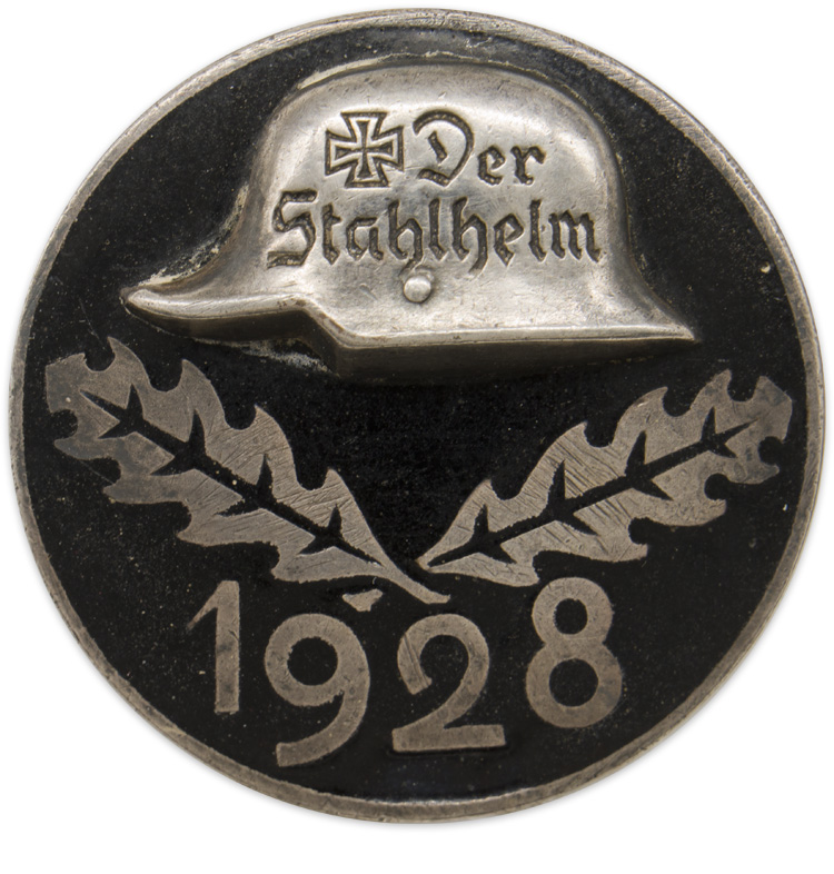 PHYSICAL DESCRIPTION: A slightly convex, 31mm diameter, nickel-silver alloy badge, against whose black enameled obverse is pinned a profiled M16 helmet, above whose chin strap rivet is stamped an Iron Cross followed by "Der Stahlhelm" in Gothic script. The recessed Iron Cross and lettering have been darkened in a way that highlight them. Beneath the helmet, the enamel breaks to form two crossed oak leaves above a "1928" date (this badge was available with consecutive dates from 1919-1932). To the reverse is a hinged, vertical pin and is complete with the original. To the right of the pin is embossed the manufacturer’s logo of an underlined and stylized "S," "T," and "H." To the left of the pin is embossed "Ges. Gesch.," for "Gesetzlich Geschützt" (By-law Protected). Badge is "935" silver content marked.