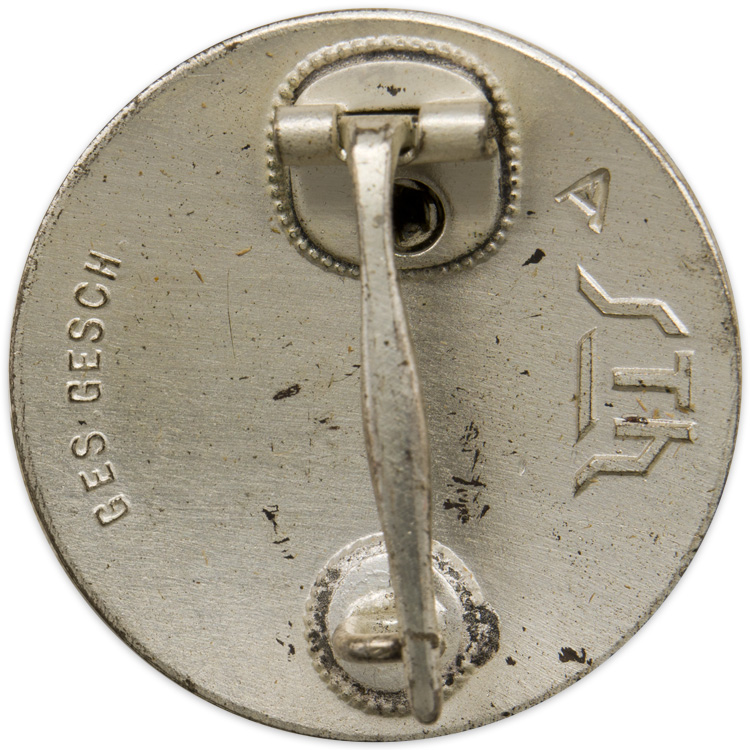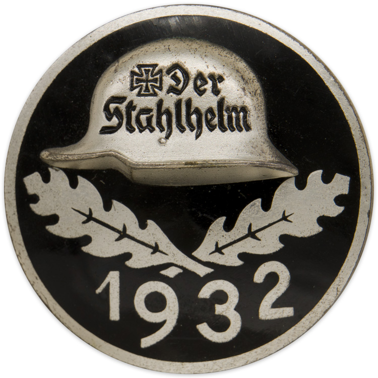PHYSICAL DESCRIPTION: A slightly convex, 31mm diameter, nickel-silver alloy badge, against whose black enameled obverse is pinned a profiled M16 helmet, above whose chin strap rivet is stamped an Iron Cross followed by "Der Stahlhelm" in Gothic script. The recessed Iron Cross and lettering have been darkened in a way that highlight them. Beneath the helmet, the enamel breaks to form two crossed oak leaves above a "1932" date (this badge was available with consecutive dates from 1919-1932). To the reverse is a hinged, vertical pin and is complete with the original. To the right of the pin is embossed the manufacturer’s logo of an underlined and stylized "S," "T," and "H." To the left of the pin is embossed "Ges. Gesch.," for "Gesetzlich Geschützt" (By-law Protected).
