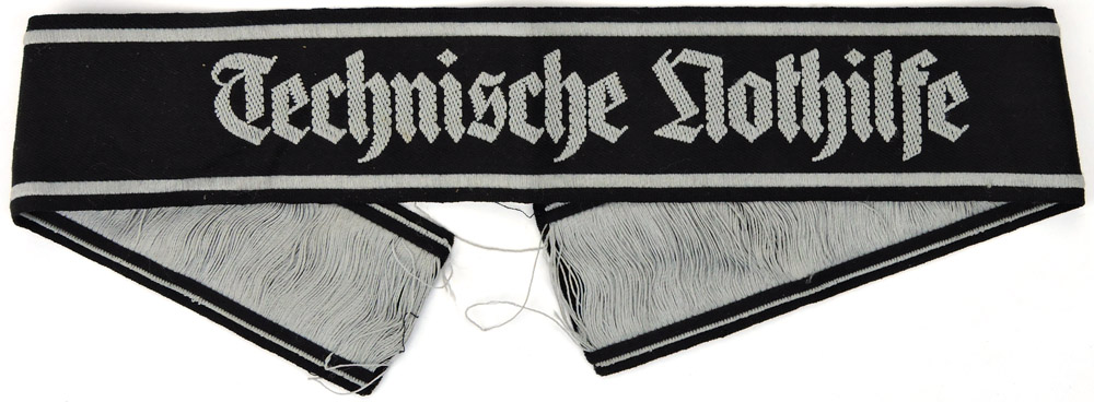 PHYSICAL DESCRIPTION: Roughly, 39mm wide, 43cm long, ribbed black rayon construction cufftitle with BeVo woven Gothic script, "Technische Nothilfe" in matte silvery/grey cotton threads. Both the top and bottom edges of the cufftitle are bordered in vertically woven matte silvery/grey cotton threads. The reverse of the cufftitle has the typical loose, vertical threads from the weaving process. The cufftitle is in overall excellent condition with light age.