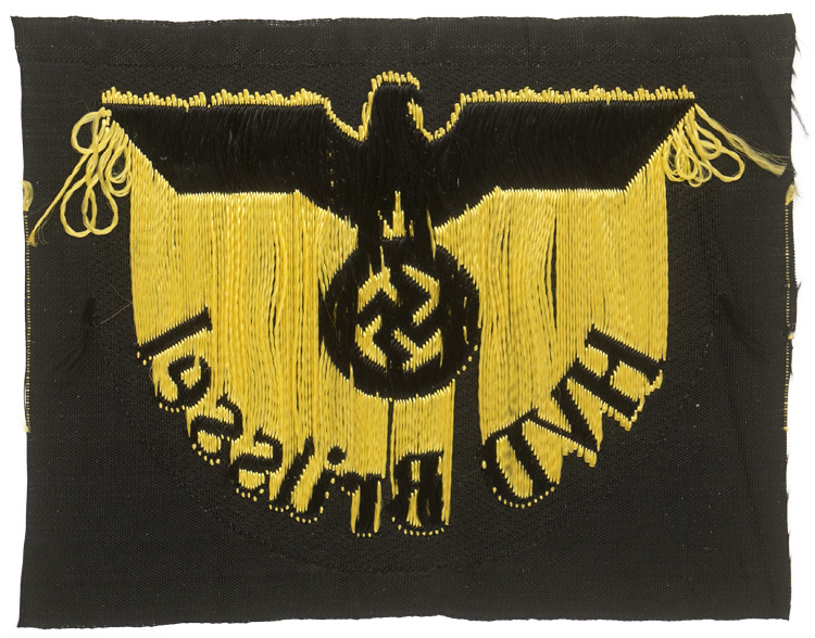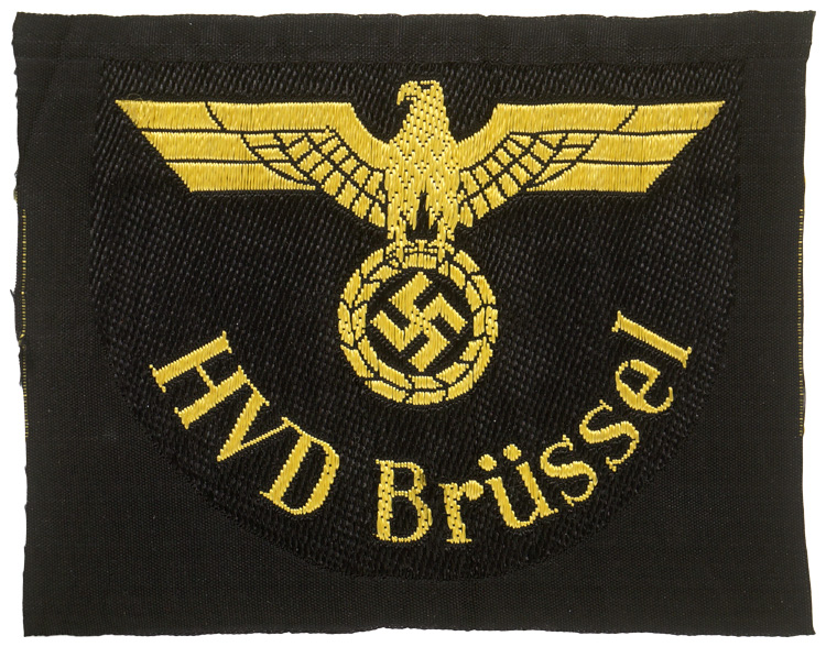 PHYSICAL DESCRIPTION: A machine woven, right facing eagle with outstretched wings and a wreathed, mobile swastika in its talons, positioned above the arching script, "HVD Brüssel." All of the threads are bright golden-yellow, against a half-moon. The insignia indicates service with the "Brüssel" division of the "Hauptverkehrsdirektion.". Still on its original factory roll backing material.