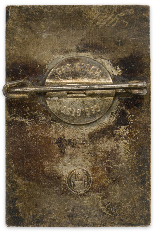 An alloy and enamel badge in the form of a vertical rectangle, 24mm wide and 36cm tall. The image to its obverse is of clasped hands before a mobile swastika, with "Deine Hand" (Your Hand) above and "Dem Handwerk" (To-the Handicrafts) beneath. The background is of patterned, translucent red enamel. A horizontal pin-back device is crimped to a circular plate to the reverse, underneath which is a maker’s logo.