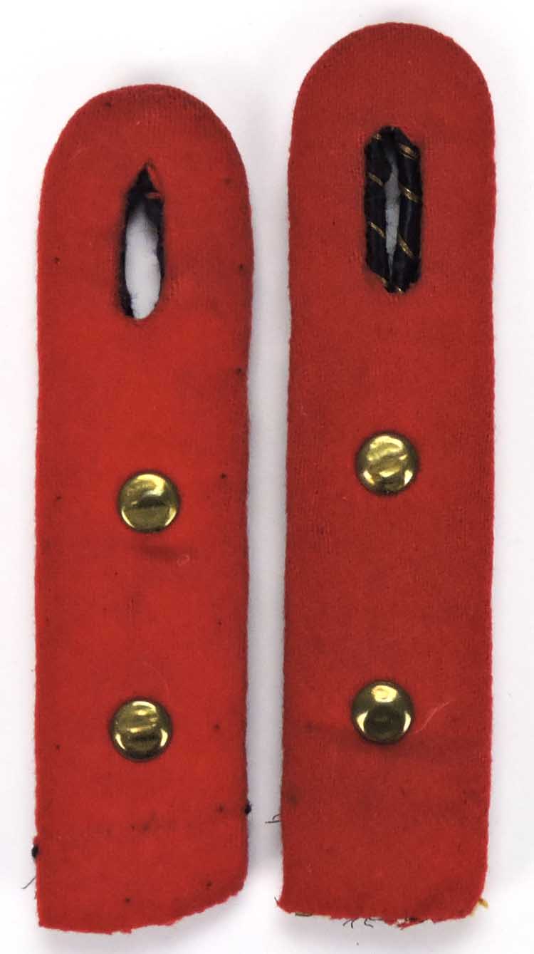 PHYSICAL DESCRIPTION: Sewn on shoulder boards. Underlay in red wool, and doubled cords to their surfaces, the outermost in gold with navy blue chevrons, and that to the inside in navy blue with gold chevrons. Double rank pips, represented pay groups 12.