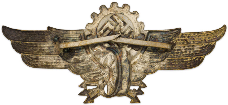 DAF insignia superimposed of the winged railway insignia. Alloy with a silver wash construction. Both original prongs complete. Nice!