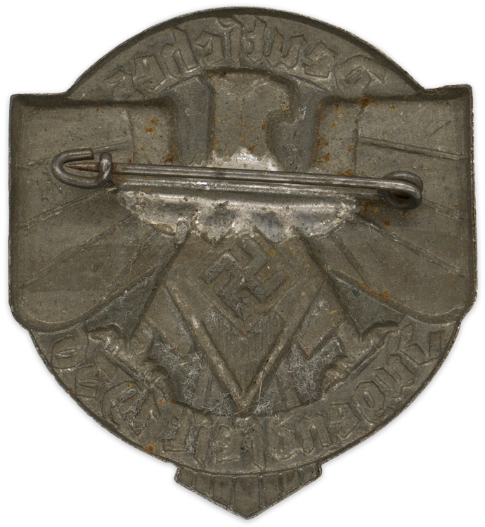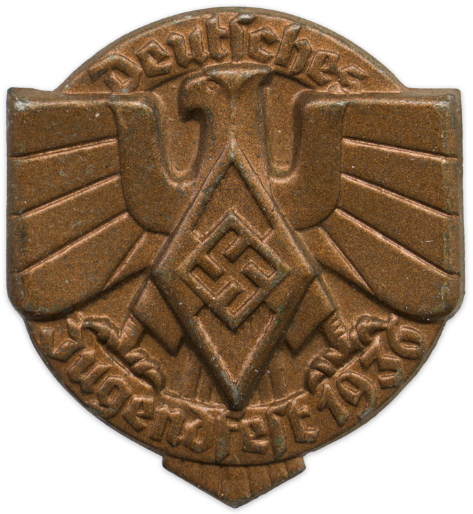 PHYSICAL DESCRIPTION: Stamped metal badge with a bronze wash. The badge takes the form of a stylized eagle upon whose breast is the HJ diamond and swastika, with "Deutsches" scrolled above and "Jugendfest 1936" below. To the reverse is a horizontal pin-back device.