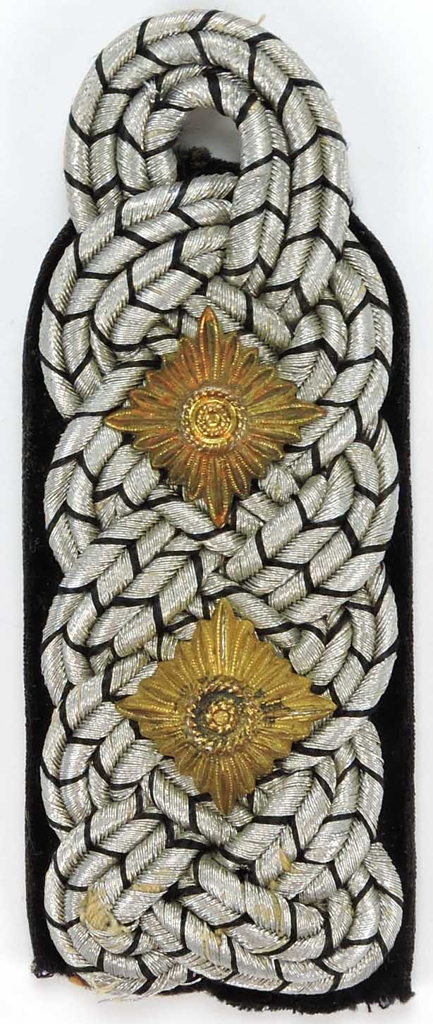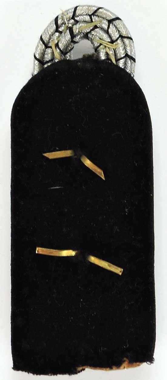 PHYSICAL DESCRIPTION: Second pattern sew on shoulder board, designed by Egon Jantke and used from 1936 until 1945. The upper surface of the board is comprised of interwoven, doubled silver-aluminum cords, segmented with narrow black chevrons with a double rank pips indicating the rank of an "Oberstarbeitsführer". The cords form a button loop beyond where it is sewn to its stiffened, black velvet underlay, which extends along the edge to form visible piping.