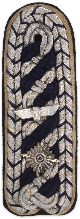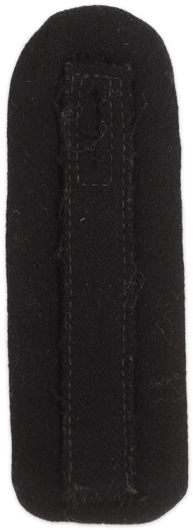 PHYSICAL DESCRIPTION: Slip on shoulder board features dual, outer edge, bright silver/aluminum Russian braid with evenly spaced, interwoven black "V"s, encompassing dual, inner, purple/blue braids interwoven with dual bright silver/aluminum Russian braid with evenly spaced, interwoven black "V"s, mounted on an black wool truppenfarbe base. Silver-washed winged railway insignia and single rank pip.