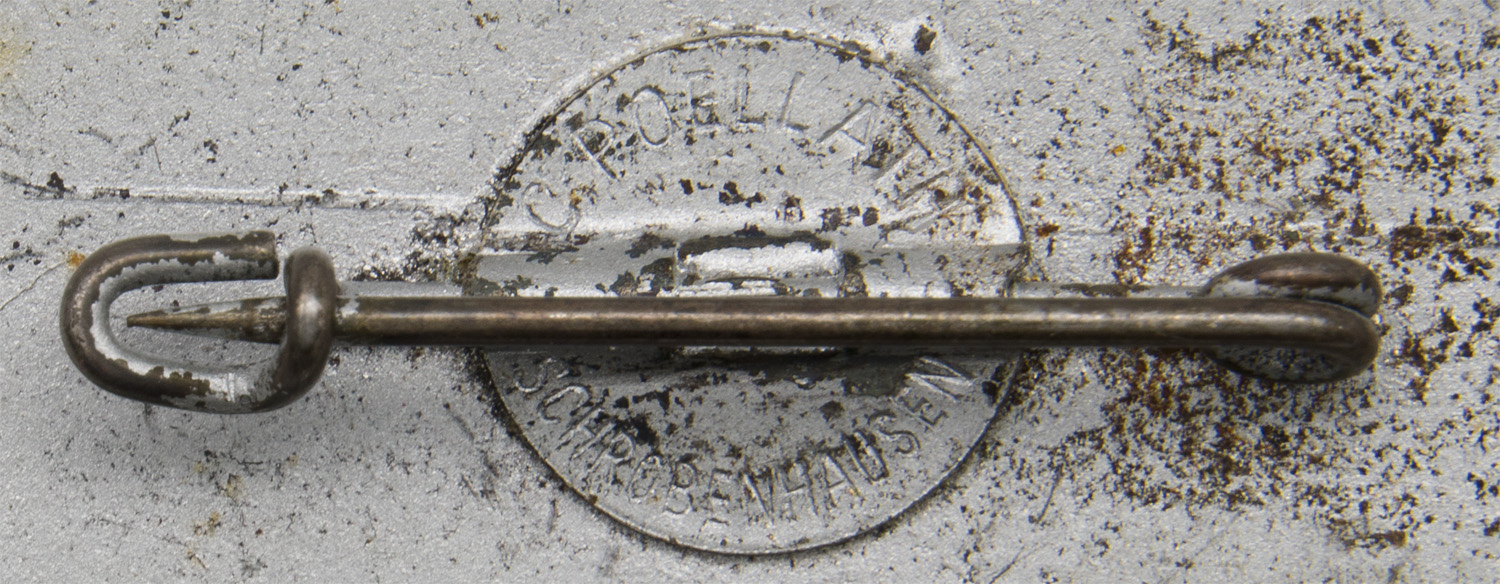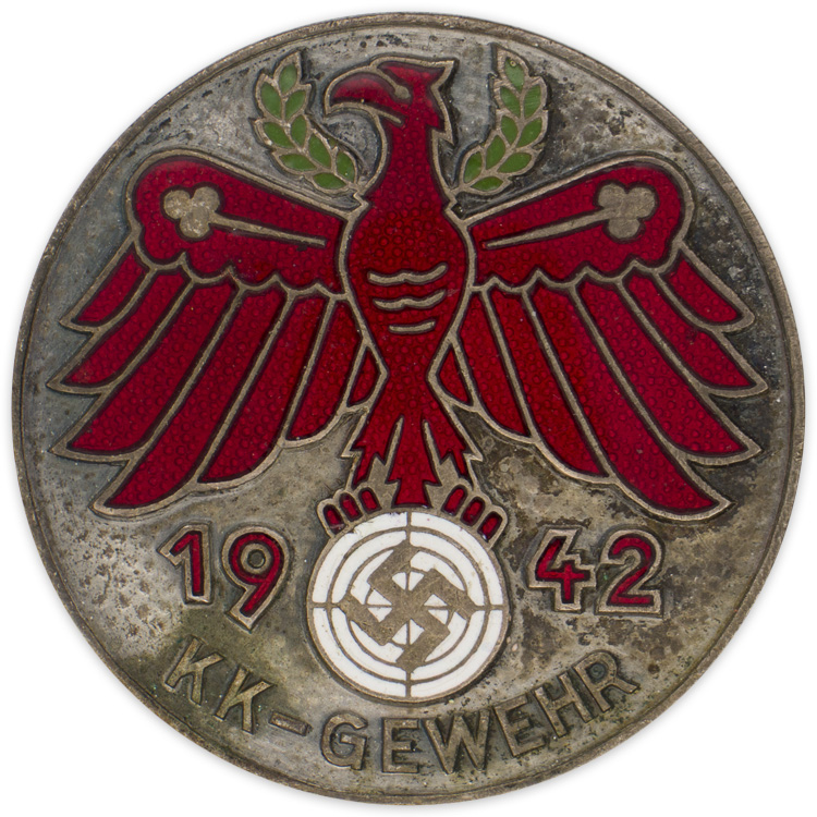 PHYSICAL DESCRIPTION: A 40MM diameter, stamped alloy badge with painted detail on a pebbled, golden base. A green laurel-leaf wreath crowns a stylized red eagle clutching a target with a superimposed mobile swastika. The target is flanked by the red date "1942," with the embossed script to the bottom, "KK -Gewehr". The reverse has the impressed maker's name, "C. Poellath," and "Schrobenhausen," to the soldered base of the intact pin back device.