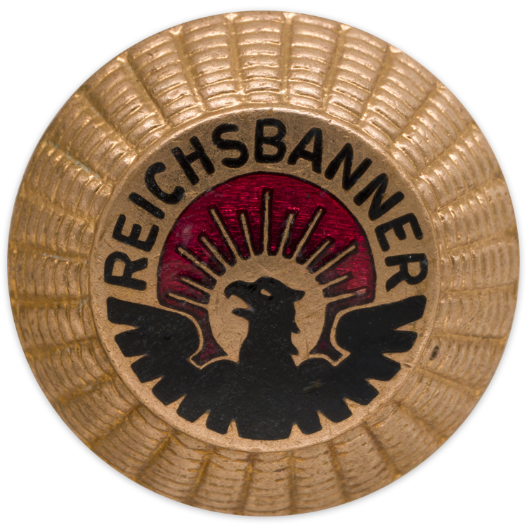 The Reichsbanner Organization was organized in February of 1924 and typically supported the Republic and SPD (German Socialist Party). There motto was "Swartz-Rot-Gold" (Black, Red, Gold Banner of the Realm). In March of 1933 the organization was banned by the NSDAP.PHYSICAL DESCRIPTION: Roughly 24mm visor cap insignia. Original prongs complete. Scarce as not many survived.