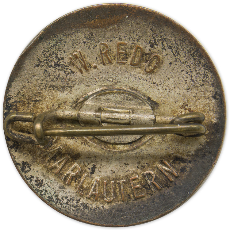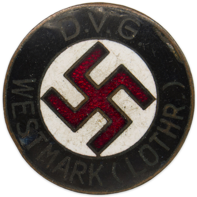 PHYSICAL DESCRIPTION: A 23mm diameter, die struck alloy and enameled badge featuring a black outer border, edged in silver, with the silver script, "D.V.G. Westmark (Lothr.)" encompassing a white field with a red mobile swastika, also edged in silver. A pebbled field is visible below the translucent red enamel. To the reverse is soldered a pin-back device with a base plate. Maker marked to "W.REDO".