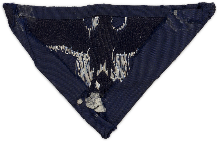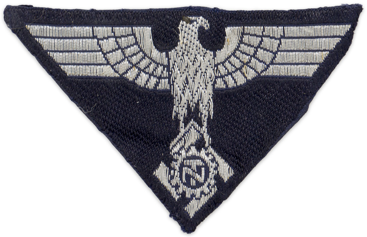 PHYSICAL DESCRIPTION: The insignia is comprised of a machine woven eagle clutching a mobile swastika, which has the TeNo logo inside a cogged wheel to its center, in silver/aluminum thread on a dark blue inverted triangular base.