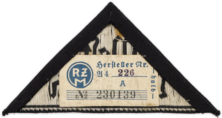 PHYSICAL DESCRIPTION: Black rayon construction isosceles triangle with a machine woven Gothic script in two lines, "West Westfalen" in grey to its interior. Complete with original RZM tag. Nice.