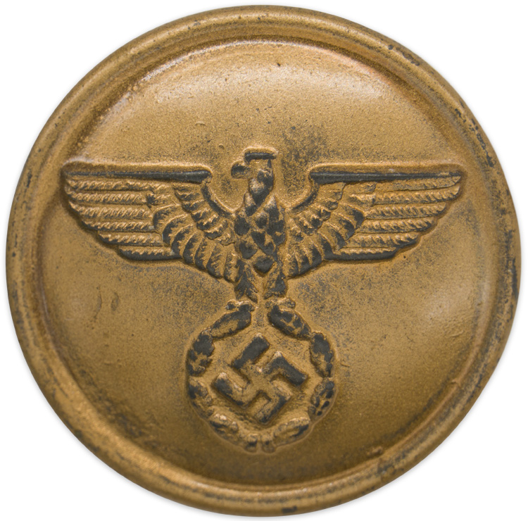 25mm diameter, uniform button, to whose convex obverse is embossed a spread-winged eagle with a wreathed, mobile swastika clutched in its talons. Maker marked.