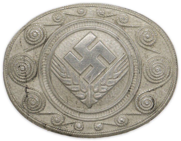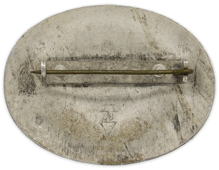 PHYSICAL DESCRIPTION: A finely detailed, 45mm wide and 35mm tall, horizontally oval, injection molded alloy brooch with a silver wash. The brooch features embossed stylized "rope" coils surrounding a central recessed, ribbed, circular field which encompassing an embossed, canted swastika flanked by embossed sheaths of wheat on a pebbled background field. Makers marked to Assmann.