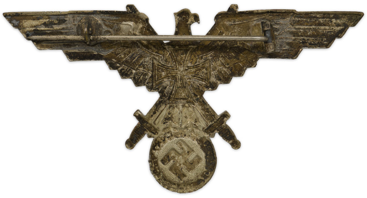 PHYSICAL DESCRIPTION: A stamped alloy, silver-washed eagle, whose spread wings have a span of 95mm, with a wreathed, mobile swastika in its talons, and a Iron Cross to its breast (with black painted center), behind which are crossed swords. A horizontal pin-back device, with a hinge and catch, is to its hollow-backed reverse. "Ges." is embossed to the reverse of one of the eagle's wings, and "Gesch.," to the other, for "Gesetzlich Geschützt" (By-law Protected). Fairly hard eagle to find.