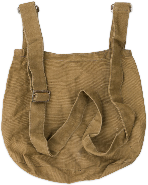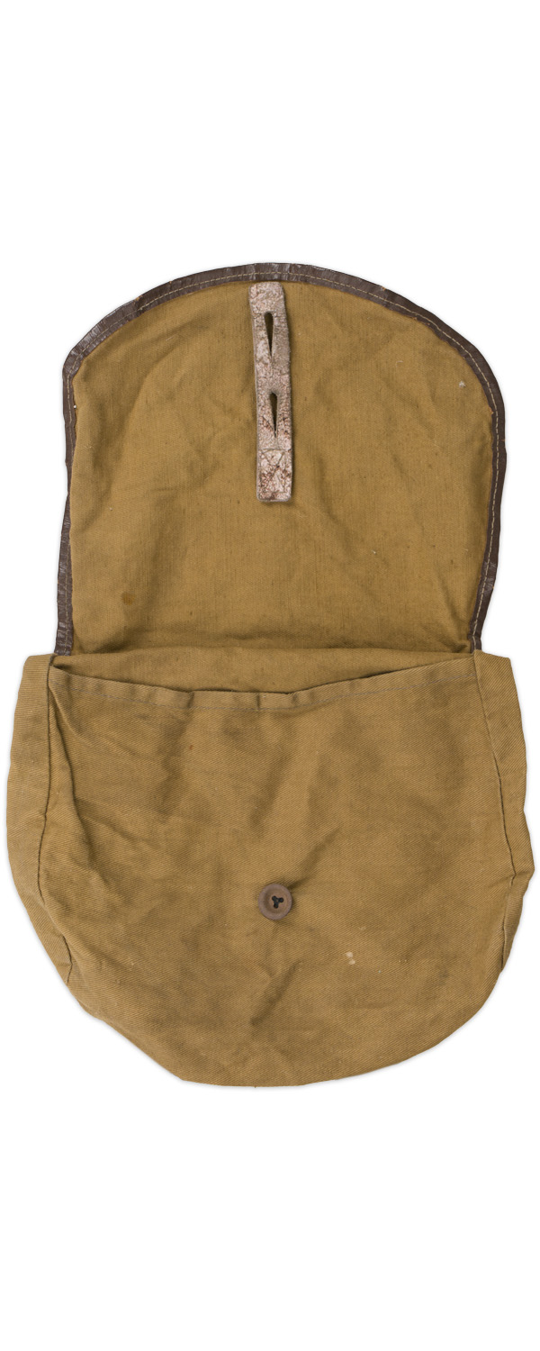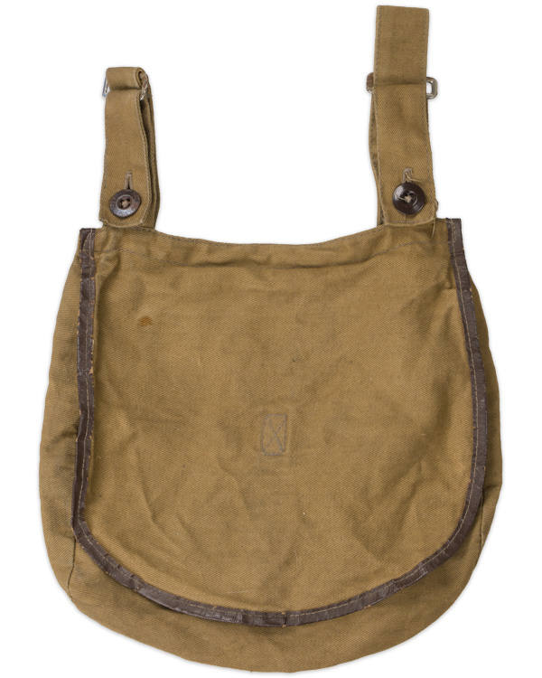 Private purchase tan-colored, water repellent, canvas bag with leather and metal fittings. Complete with all buttons and straps. Shows the expected age and use, but overall nice condition.