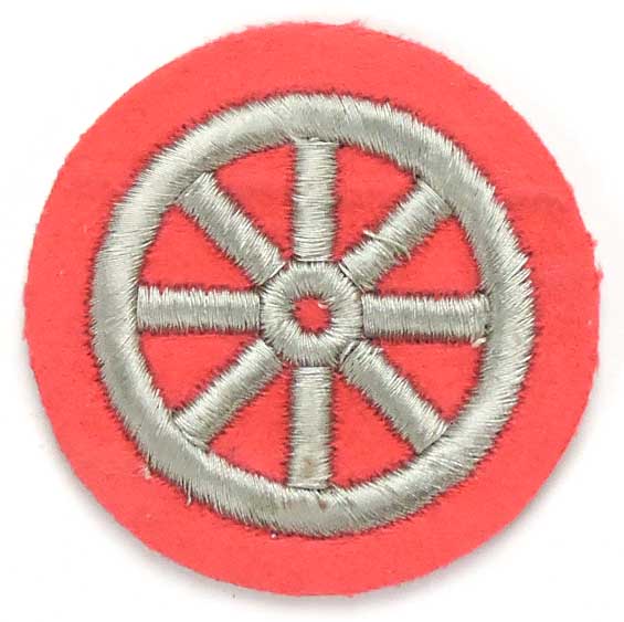 PHYSICAL DESCRIPTION: Roughly 45mm diameter, pink wool construction badge with a machine embroidered, eight spoke steering wheel in silver/grey threads to the center. The reverse of the badge has a ribbed tan cotton twill backing. Original RZM/HJ tag with red printed script is complete.