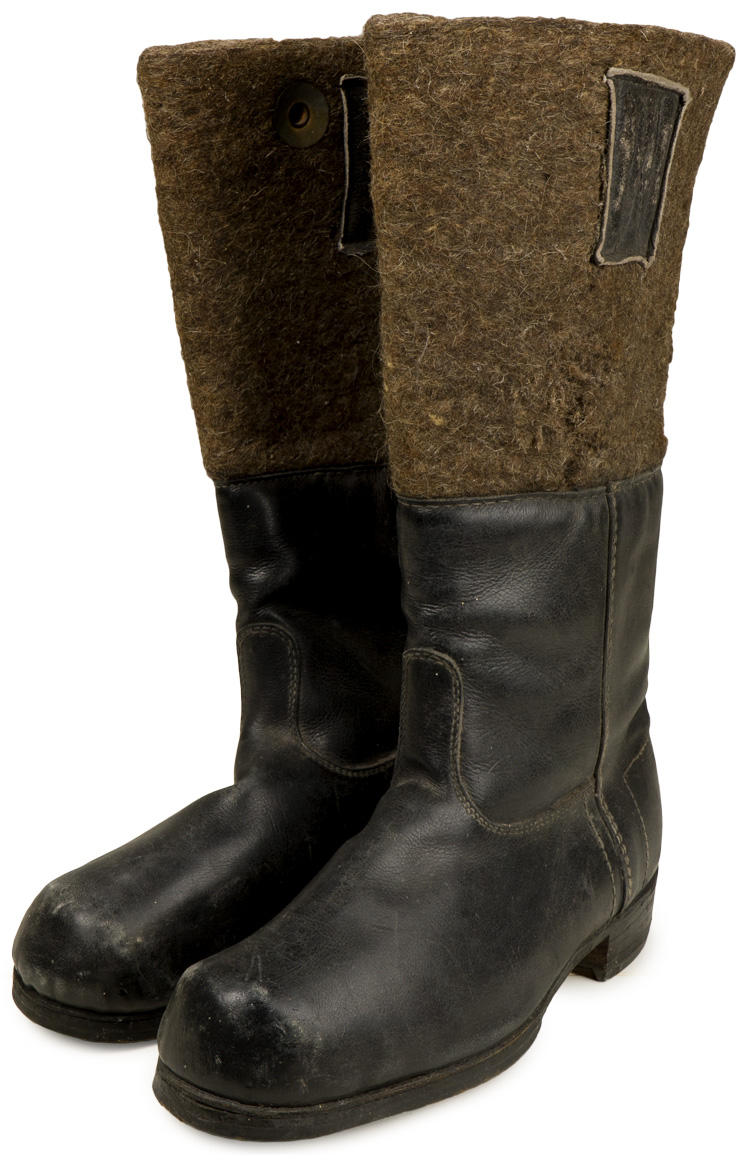 BACKGROUND: The felt and leather boots were originally introduced after the first devastating winter in Russian as the standard leather marching boots didn’t provide the warmth required in the extreme cold. The felt and leather boots came in two styles with a lighter weight style which offered warmth and enabled the wearer to retain a degree of mobility and a second heavier felt and leather over-boot intended for wear by stationary personnel such as vehicle drivers, guards and sentries. The lighter style felt and leather boots were designed to replace the leather marching boot while the heavier felt and leather over-boots were designed to slip over the leather marching boot. Both of the boots gained widespread popularity by all personnel in the sub-zero temperatures on the Eastern front. Both styles of the felt and leather boots were distributed to EM/NCO’s for the winter season, (September 15TH to April 15TH), with other winter garments and were to be returned to the units clothing depot in April for storage, repair and cleaning to be reissued the following September. Originally Officers and senior NCO’s responsible for purchasing their own uniforms and footwear were required to purchase the felt and leather winter boots until regulations of December 1942 extended the issue winter clothing and footwear to all ranks in the colder theatres of operation.