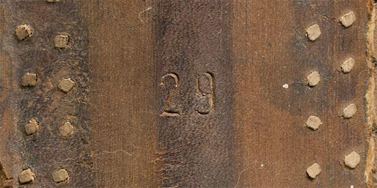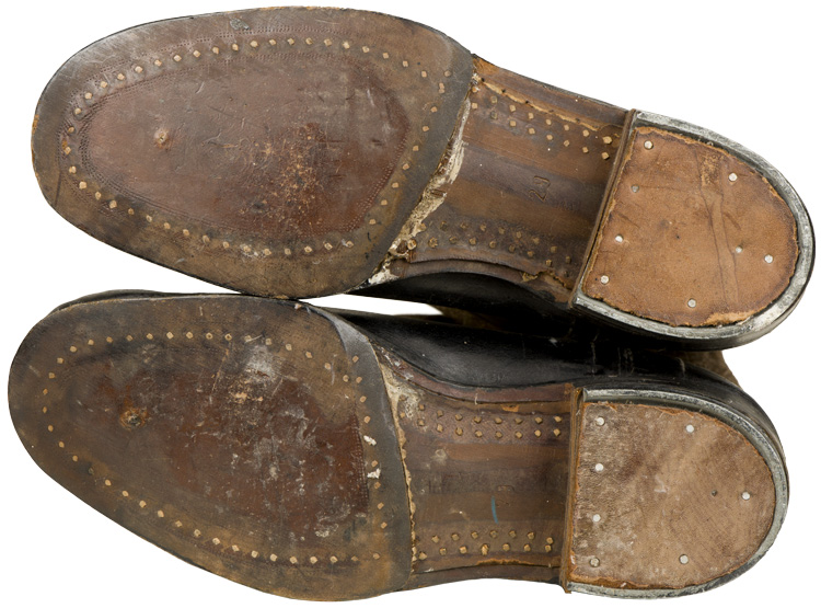 PHYSICAL DESCRIPTION: Compressed and molded grey felt and black leather construction boots are roughly, 43cm tall from the top of the heel to the top of the back calf section. The top 20cm of the calves are in grey compressed and molded felt while the bottom 23cm are in black leather. The boots have stacked leather heels and forward soles. The insteps and forward soles both show the typical diamond shaped wooden retaining dowels. The insteps of the boots are both well marked with impressed size numerals, "29". One side of the calf section of each boot has an inset, steel grommet with a small sheet metal panel to the interior of each with impressed markings to each that consists of "R.B.D. BERLIN", indicating, Reichsbahndirektion Berlin, (National Railway Directorate Berlin), followed by a inventory number and 1943 date. The boots are in overall good condition with minimal age toning and chafe wear to the leather and numerous small moth nips to the felt. The boots are roughly size 10.