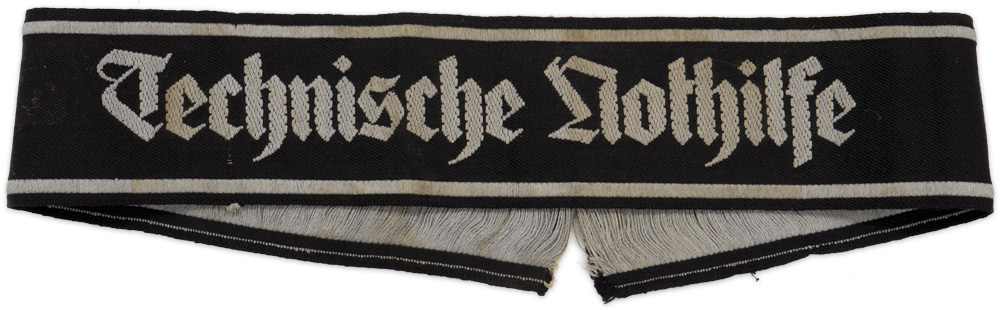 PHYSICAL DESCRIPTION: Roughly, 39mm wide, 40cm long, ribbed black rayon construction cufftitle with BeVo woven Gothic script, "Technische Nothilfe" in matte silvery/grey cotton threads. Both the top and bottom edges of the cufftitle are bordered in vertically woven matte silvery/grey cotton threads. The reverse of the cufftitle has the typical loose, vertical threads from the weaving process. The cufftitle is in overall excellent condition with light age.
