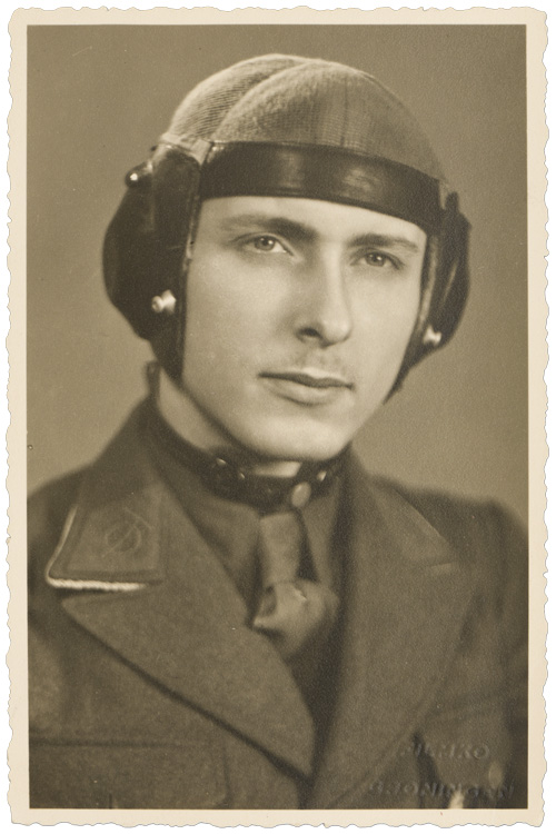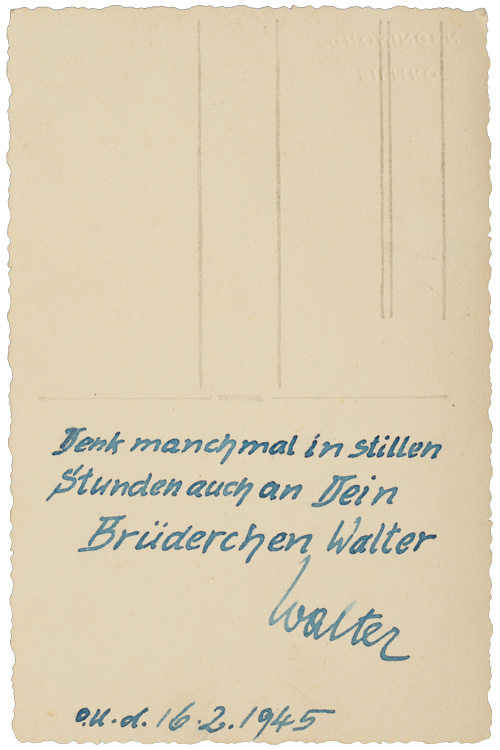 A 9cm x 13.5cm black and white studio portrait of an Organization Todt PILOT. Studio portrait wearing a flying helmet with earphones in full uniform. His OT diamond collar tabs are clearly seen on his right collar (the left collar is away from the camera). Organisation Todt (OT) was a civil and military engineering organization in Nazi Germany from 1933 to 1945, named for its founder, Fritz Todt, an engineer and senior Nazi. The organization was responsible for a huge range of engineering projects both in Nazi Germany and in occupied territories from France to the Soviet Union during World War II. It became notorious for using forced labor. From 1943-45, during the late phase of the Third Reich, OT administered all constructions of concentration camps to supply forced labor to industry. Very few people know the Organization Todt had its own aircraft and pilots during the war to facilitate the work of the organization and movement of officials to work sites! Inscription on reverse to the man’s brother Walter, dated February 2, 1945. On Mimosa photo paper.