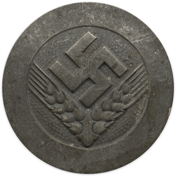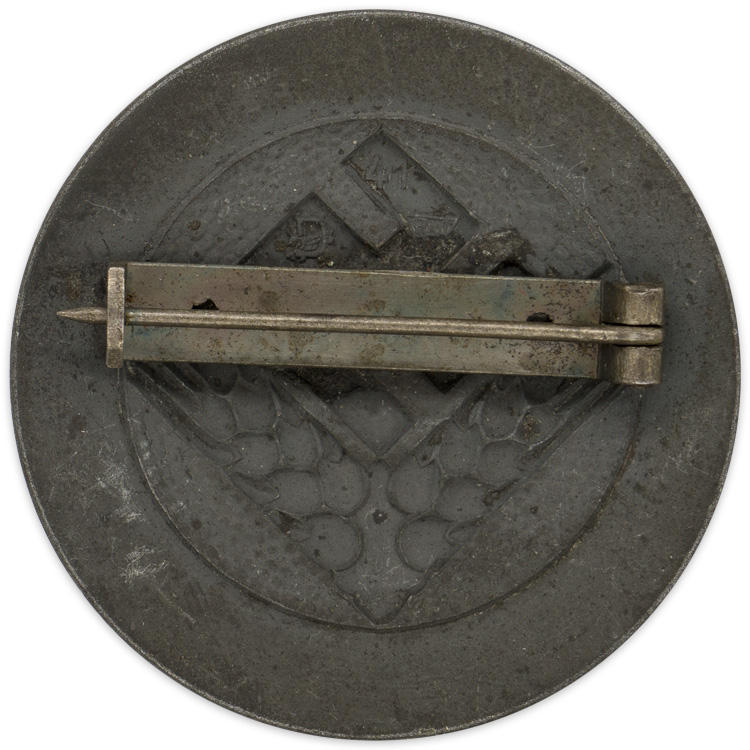 PHYSICAL DESCRIPTION: A third pattern (1939), die struck zinv, convex brooch. The 46mm diameter brooch features a smooth outer border encompassing a pebbled field, upon which is embossed a mobile swastika held aloft by two sprigs of barley. Complete with original pinback device. Maker marked and dated for 41.