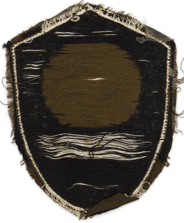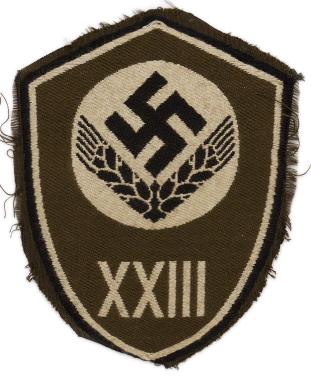 PHYSICAL DESCRIPTION: Machine woven insignia approximately 90mm x 70mm, featuring an large black swastika over two ears of wheat in white circular field. Below are the until numbers in roman numerals "XIII" for the Bezirksnummer (Unit number). The main body of the insignia is in brown with a white and black border.