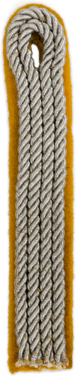 On March 25TH 1933 the DLV, Deutscher Luftsport Verband, (German Air Sports League), was established by incorporating all civilian flying clubs into the one organization. In September 1933 the DLV was further enlarged by incorporating the SA and SS Fliegersturm groups. The DLV was utilized as a camouflage civilian organization to train personnel for the future Luftwaffe. As a civilian organization it was able to circumvent the restrictions imposed by the Versailles Treaty, which prohibited a German military air service. The DLV was divided into two distinct groups with the main group consisting of civilians and a second group, entitled the Fliegerschaft, which was the secret military branch of the DLV. With the official unveiling of the Luftwaffe on February 26TH 1935, the DLV lost a substantial amount of its manpower and its previous function as a secret training ground for future pilots was rendered redundant. As a result the DLV was disbanded on April 17TH 1937 with its remaining membership being absorbed into the newly reconstituted NSFK.PHYSICAL DESCRIPTION: DLV Kettenführer shoulder board. Tro doubled cords in silver wire upon a stiff, yellow wool base, which extends along their edges to form visible piping.