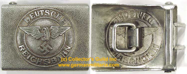 PHYSICAL DESCRIPTION: Early, injection molded, one piece aluminum example. 65mm x 50mm. Buckle features a slightly pebbled field base with embossed circular centerpiece. Slightly domed centerpiece features the Deutsche Reichsbahn emblem of a spoked, winged wheel above a canted swastika. Emblem is encompassed by a circular ribbed field with an inner and outer simulated twisted rope border, with embossed Latin script, "Deutsche Reichsbahn". Reverse with crimped on catch, prong bar and prongs all intact. Unmarked example. Nice!
